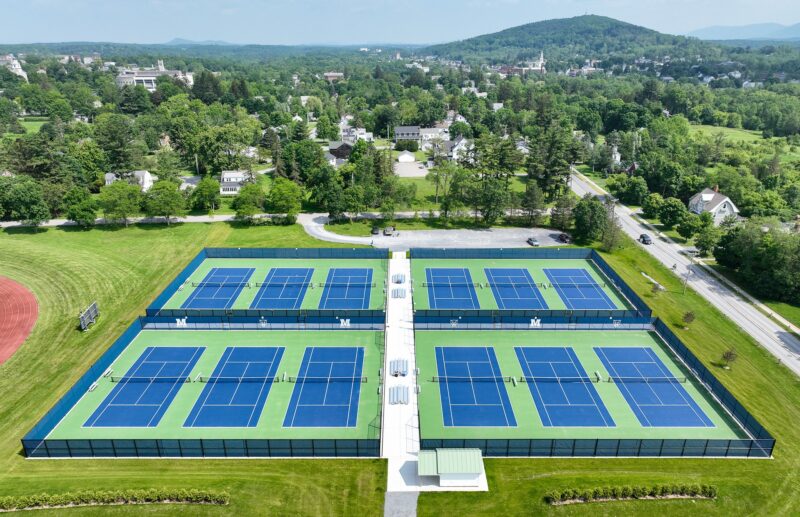 Twelve new tennis courts at Middlebury College (Middlebury, VT) surfaced in Stadium Blue and Grass Green Combination Surface. Special Thanks to Classic Turf/Tarkett Sports for the wonderful photo.
